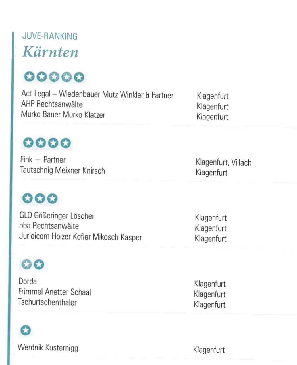 Auch im Jahr 2025 hat die renommierten Zeitschrift JUVE ein Anwaltsranking für das Bundesland Kärnten veröffentlicht. Wir freuen uns, dass AHP Rechtsanwälte - wie bereits in den Jahren 2019, 2021 und 2023 - auch in diesem Jahr mit fünf Sternen die Bestwertung erzielt hat und in Kärnten als "marktführende Einheit" bezeichnet wird. Hervorgehoben wird unsere Tätigkeit im Bank- und Gesellschaftsrecht, im Insolvenz- und im Energierecht sowie bei Liegenschaftstransaktionen und bei internationalen Transaktionen, insbesondere mit Italien. Dr. Werner Hochfellner scheint auch in der Kategorie "Führende Namen in Kärnten" auf.